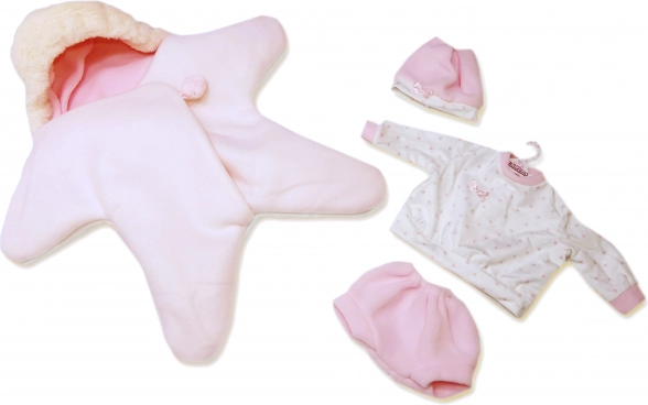 Forkæl din dukke med ekstra komfort og stil med dette 3-delte Llorens-sæt. Sættets hovedattraktion er den vendbare fleeceheldragt i stjerneform, som er superblød, varm og perfekt til både hygge og vinterture med dukken. Takket være den universelle størrelse passer den perfekt til NEW BORN-dukker på 40–42 cm.