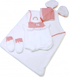 Sættet indeholder et 3-delt sæt og en dekorativ måtte med ører for endnu mere sjov ved pasning af dukken. Pakket i en plastikpose med plast- eller papbøjle – nem opbevaring og gavegivning.