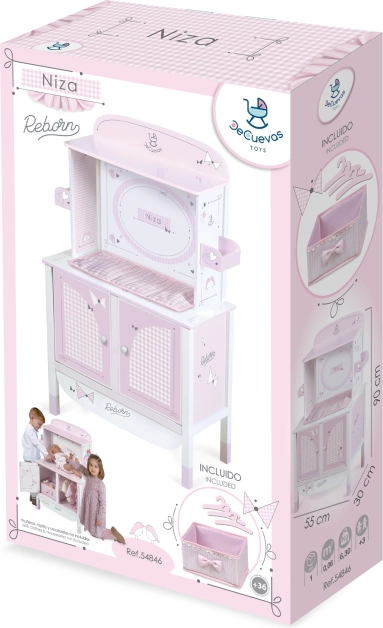 Opdag den blidt lyserøde Niza-kollektion med dette smukke og praktiske dukkeskab, som kombinerer opbevaringsplads og et puslecenter. Den nederste del tilbyder en garderobestang og en skuffe til tøj, mens den øverste overbygning fungerer som puslebord med print i kollektionens design.