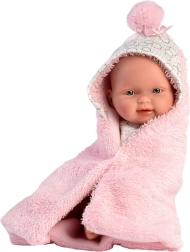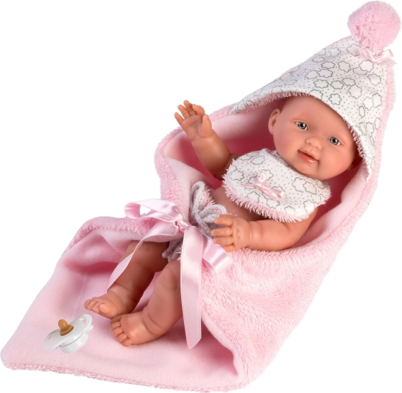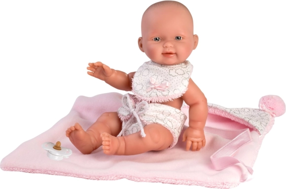 Dette todelte sæt er designet specielt til New Born-babydukke på 26 cm. Det indeholder et vendbart tæppe med hætte, som beskytter dukken og giver den et udseende som en rigtig baby.