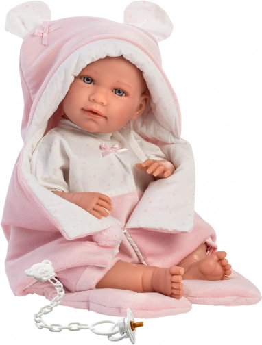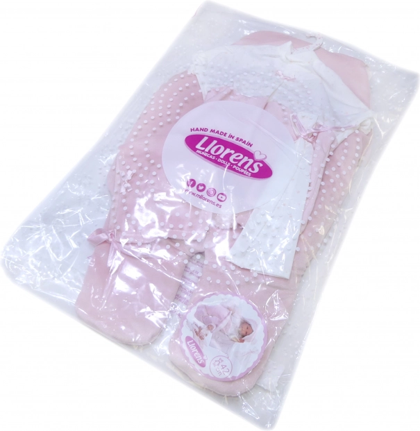 Dette vidunderlige tøjsæt til dukker er fremstillet i Spanien og inkluderer en todelt sæt, der er ideelt til dukker NEW BORN i størrelse 40-42 cm. Sættet leveres med en fløjlshurtigsvøb til autostol og dekorativt lommetørklæde, hvilket giver dukkerne et realistisk udseende.