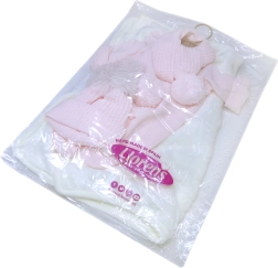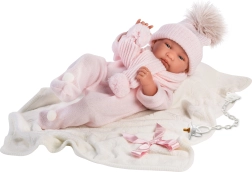 Stilfuldt 3-delt tøj til dukke baby New Born fra Llorens mærke, størrelse 43-44 cm, indeholder en dekorativ fleece-tæppe med sløjfe. Fremstillet i Spanien og giver det perfekte look til dine dukker.