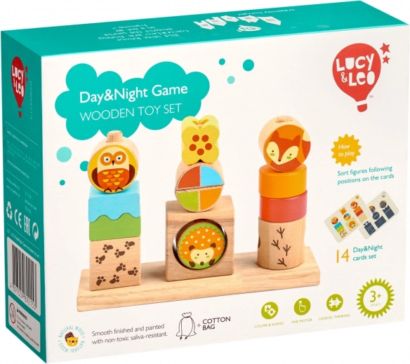 Det interaktive puslespil “Dag og nat” kombinerer leg og læring. Børn placerer farvede geometriske former og klodser med dyr på tre pinde efter de medfølgende skabeloner. Dagskortene viser farver, natkortene fremhæver former – ideelt til gradvis træning.