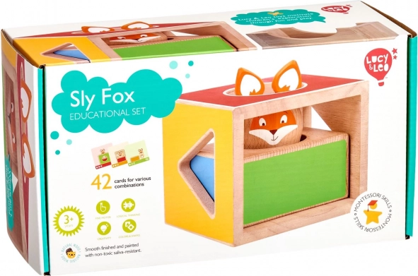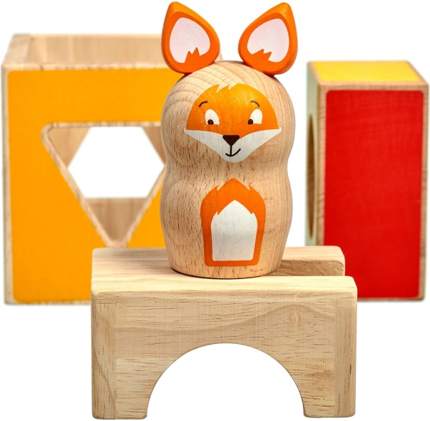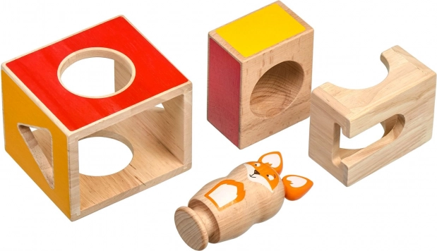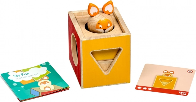 Dette pædagogiske træspil indeholder tre massive klodser med udskæringer i forskellige former, en træfigur af en ræv og et sæt dobbeltsidede opgavekort i varierende sværhedsgrad. Børn bygger og kombinerer klodserne efter forlæg, så ræven “skjuler sig” korrekt, hvorved de træner strategi og rumlig opfattelse.