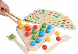 Børnene sorterer farvede kugler med pincet og ske efter mønstrene på kortene – perfekt til at udvikle finmotorik, koncentration og farvegenkendelse.