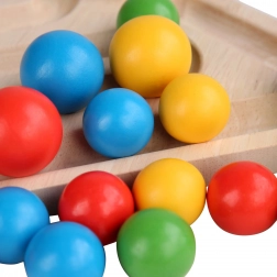 Den dobbeltsidede plade rummer også en labyrint, hvor børnene triller kuglerne gennem banen uden at tabe dem. De træner hånd–øje-koordination og tålmodighed.