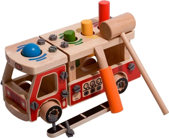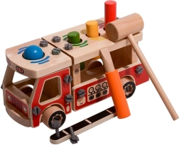 Dette kreative sæt kombinerer byggesæt og bankebænk i ét. Børn samler først en robust træbrandbil og bruger derefter fire huller på ladet til sjov bankning af farvede elementer med hammer. Takket være klare farver og varierede former understøtter legetøjet naturlig læring og koncentration.