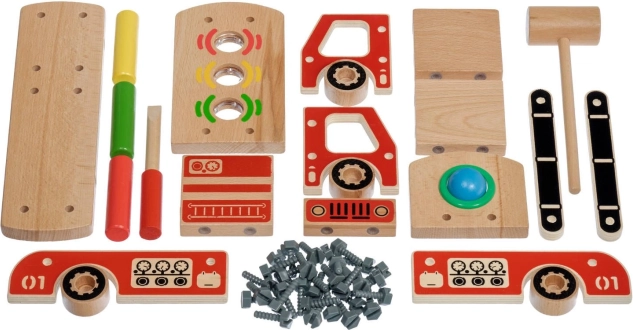 - 17 trædele til at samle bilen, skruer, 1 skruetrækker, 3 farvede pinde, 1 kugle til at banke, hammer