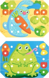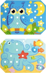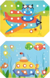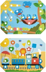 Børn vælger en af de farverige skabeloner, lægger den på træbasen og udfylder motivet med pinde ved hjælp af pincetten eller hænderne. De kan også øve snøring og brodering med de medfølgende snore. Legen understøtter naturligt koncentration, logik, tålmodighed og præcision.
