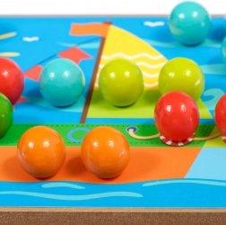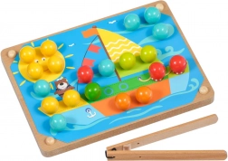 Træbasen med huller, de farvede pinde og pincetten motiverer børn til præcist greb og træner finmotorik samt hånd-øje-koordination.