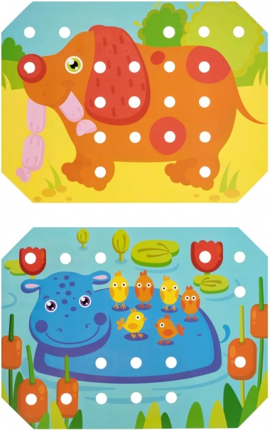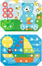 Opdag et kreativt træsortiment for børn fra 3 år, som udvikler finmotorik, hånd-øje-koordination, farvegenkendelse og tålmodighed. Sættet indeholder 70 store farvede pinde, en pincet, 12 dobbeltsidede skabeloner med dyremotiver, en træbase med huller og 4 farvede snore til brodering – et ideelt Montessori-inspireret læringsredskab til legende læring.