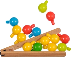 - Pakkens indhold: 70 træpinde, 1 pincet, 12 dobbeltsidede kort med dyremotiver, træbase med huller, 4 farvede snore, linnedpose.