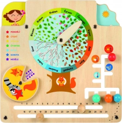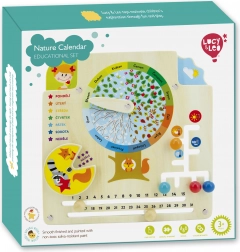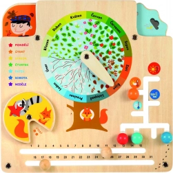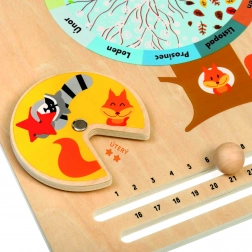 LUCY & LEOs træ naturkalender er et ideelt redskab til legende læring. I midten af pladen finder du et løvtræ med frugt og en markør for 12 måneder, så børnene let kan forbinde vinter med sne, forår med blomster, sommer med frugt og efterår med faldende blade. Samtidig lærer børnene at kende ugedage, antal dage i måneden, vejret, temperatur og passende påklædning til forskellige forhold.