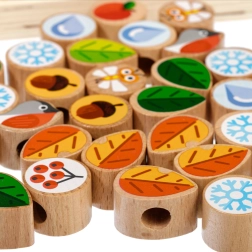 Dette kvalitets træ-sæt giver børn sjov snøring og træksyning på en solid træplade med stander. Sættet indeholder farvede brikker (blade, blomster, bær, agern, frugter, snefnug, insekter m.m.) og flere snore til uendelige variationer. Brikkerne kan efter leg opbevares i den praktiske linnedpose.
