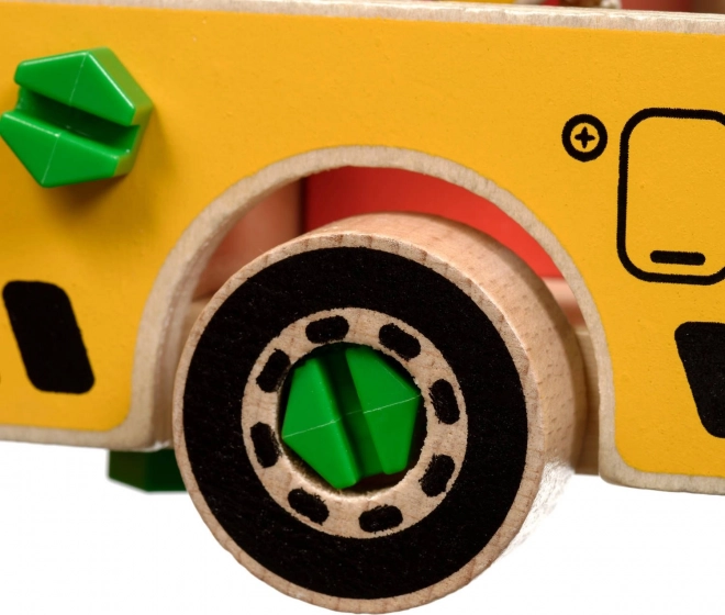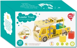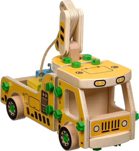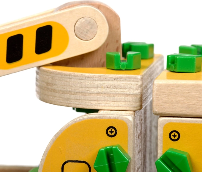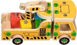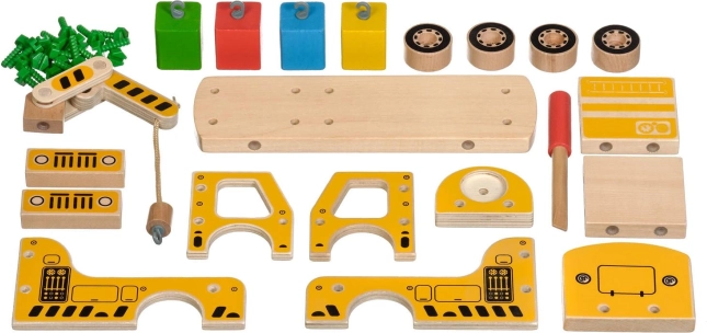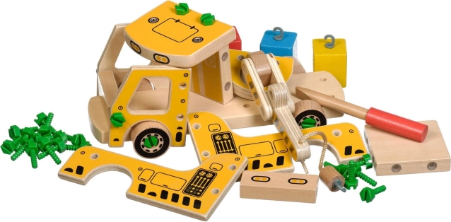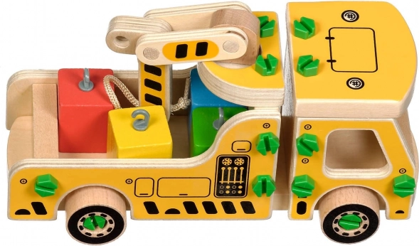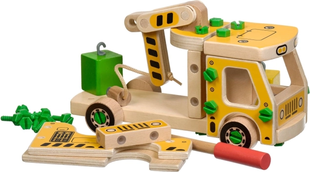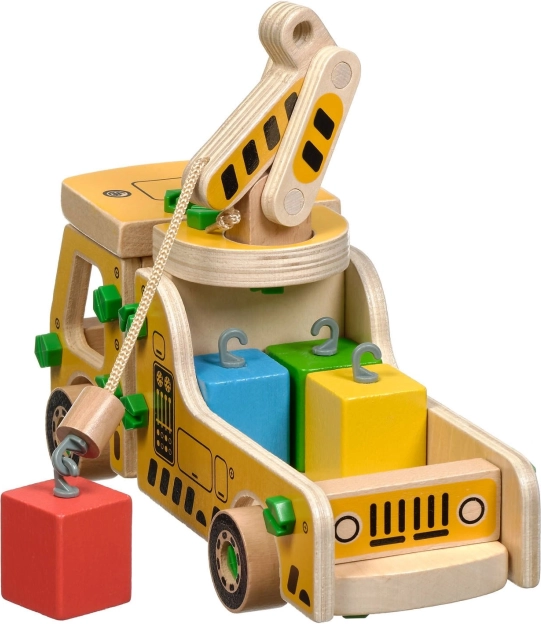 Pakken indeholder 16 trædele til at samle kranen, skruer, skruetrækker og 4 farvede klodser, der udgør lasten. Dette legetøj fungerer også som et Montessori hjælpemiddel, der hjælper barnet med at udvikle forskellige færdigheder effektivt.