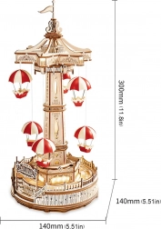 Dette raffinerede 3D træpuslespil er inspireret af det klassiske faldtårn fra forlystelsesparker. Den sekskantede base og de sidevendte, gennemskinnelige vinduer lader et varmt lys skinne igennem og understreger den unikke atmosfære. Karussellen drives af en batterimotor og oplyses af LED-lys, mens berøringsstyring gør det muligt at styre bevægelse og lyd uafhængigt.