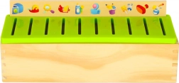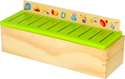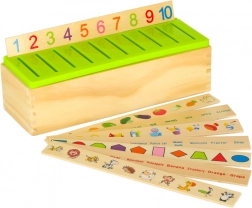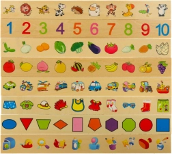 Denne smarte træleg udvikler det visuelle sanseapparat, koncentration og hånd-øje-koordination. Opgaven er at vælge den rigtige lille billedbrik og indsætte den i slotten under det matchende motiv på den store liste. Med tydelige illustrationer (tal, former, dyr, frugter, genstande) træner børn navngivning og sortering.