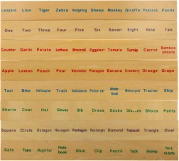 Inkluderer brikker med tal, former, dyr, frugter og genstande samt engelske navne til de første skridt i et fremmedsprog.