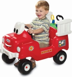 Børn kan stige ind i denne røde retro brandbil og nyde kreativ leg. Bilen drives af børns små fødder eller kan skubbes af en voksen, hvilket også giver sjov for mindre børn. Takket være den let aftagelige 9-liters tank med slange, er der altid vand ved hånden til at slukke imaginære brande.