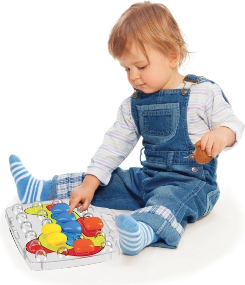 QUERCETTI Mozaika Pixel Baby er et kreativt legetøj designet til at skabe mosaikker ved at indsætte farvede knapper i en perforeret plade efter et forudlagt mønster eller egen fantasi. Dette produkt understøtter farvegenkendelse, udvikling af finmotorik og koordination af bevægelser.