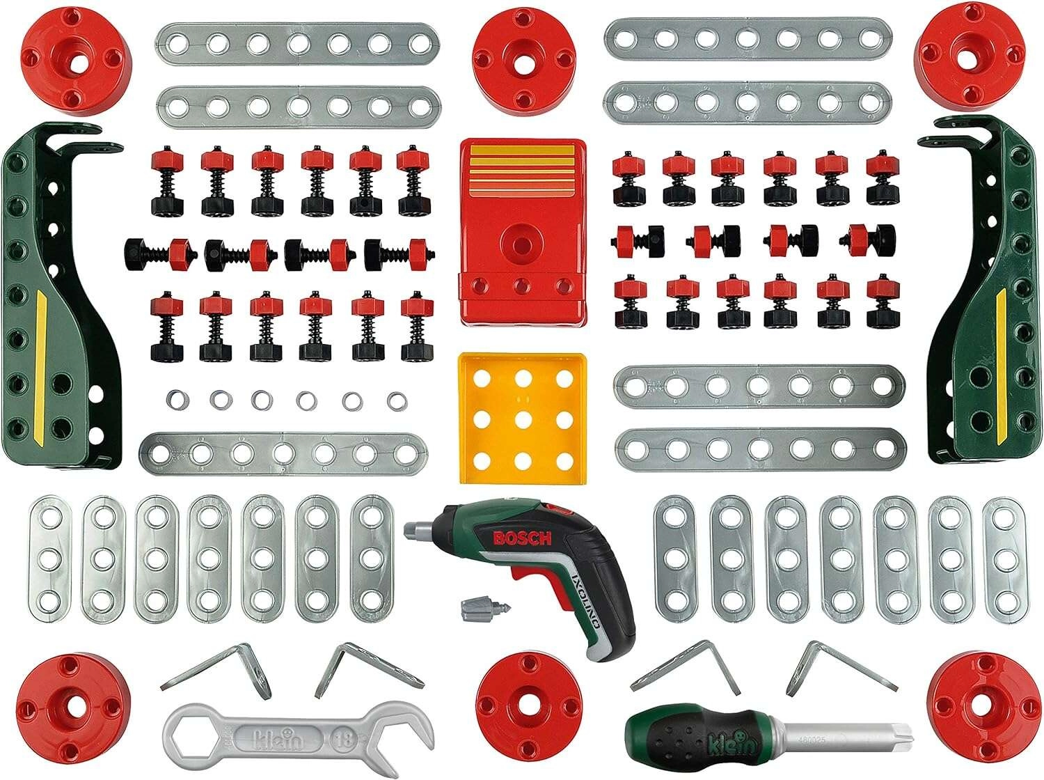 - Børne-batteriskruetrækker BOSCH Ixolino, håndnøgle, skruetrækker, forbindelsesdele (skruer, møtrikker, lister, vinkelbeslag, hjul)