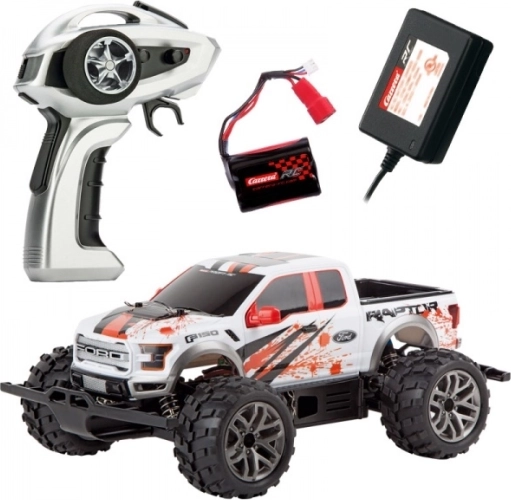 RC‑bilen Carrera PROFI FORD F‑150 RAPTOR i skala 1:18 er designet til fart, holdbarhed og præcis håndtering. Den digitalt proportionale styring sikrer jævn gasrespons og følsomme sving, mens 4WD, oliedæmpere og høj frihøjde giver stabilitet og trækkraft på forskellige underlag. Funktionelle for- og baglygter øger desuden køreoplevelsen.