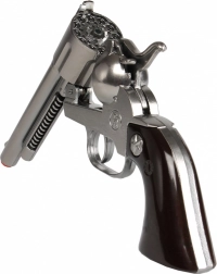 Stilfuld cowboy-revolver i klassisk design, som glæder både små pistolentusiaster og fans af westerntemaer. Metalkroppen giver legetøjet holdbarhed og en behagelig vægt i hånden, mens den tydelige spids klart viser, at der er tale om et sikkert stykke legetøj. Med en tromle til 12 skud er legen flydende og underholdende.