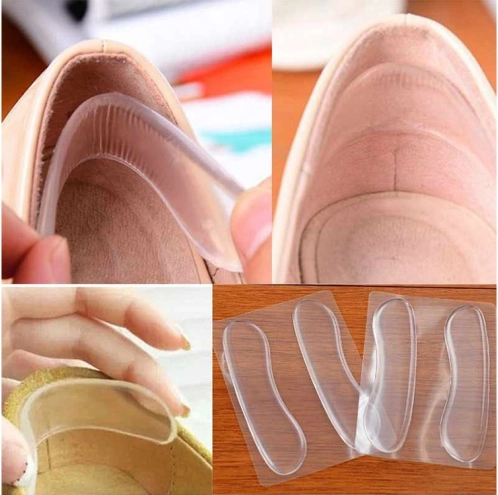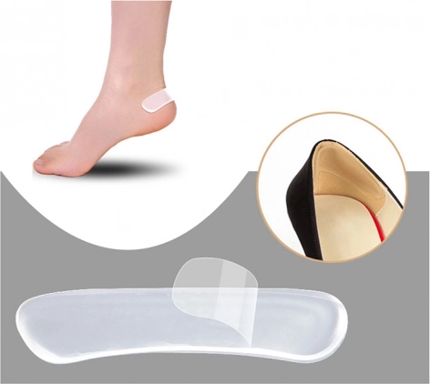 Gennemsigtige silikonegel-hælindlæg sikrer komfort under gang, beskytter mod skavsår og forhindrer at hælen glider ud af løsere fodtøj. Takket være det selvklæbende lag bliver de siddende, og den farveløse gel er næsten usynlig i både elegante og sommerlige sko.