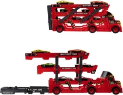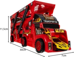 Rød biltransporter til små racerkørere tilbyder en 3-niveaus platform, en nedfældelig bagrampe og en forreste udkørsel. Medfølger 6 metalbiler og en sjov affyringsmekanisme til hurtige starter og actionfyldt leg.