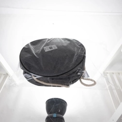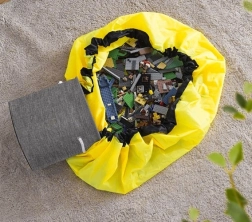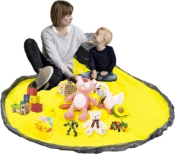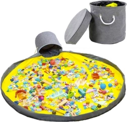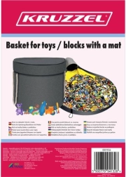 Fold det store tæppe ud (Ø 135 cm), lad børnene lege, og stram efter leg snoren med stopper – legetøjet samles på et øjeblik i kurven.