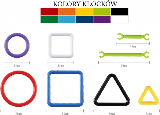 Kreativt byggesæt med patter, hjul, firkanter og trekanter giver børn timevis af leg og læring. Med de mange former og 10 farver støtter det udviklingen af fantasi, rumlig forståelse og finmotorik. Af delene kan man nemt bygge cykel, bil, liggestol eller parasol – et ideelt valg for små konstruktører.