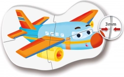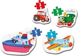 Opdag den sjove verden af puslespil for de mindste. Dette sæt indeholder fire separate puslespil med motiver af forskellige transportmidler og gradvist stigende sværhedsgrad (2, 3, 4 og 5 brikker), så børnene kan opbygge selvtillid og færdigheder trin for trin.
