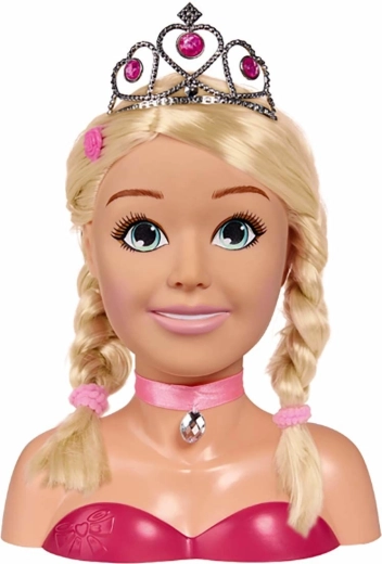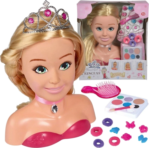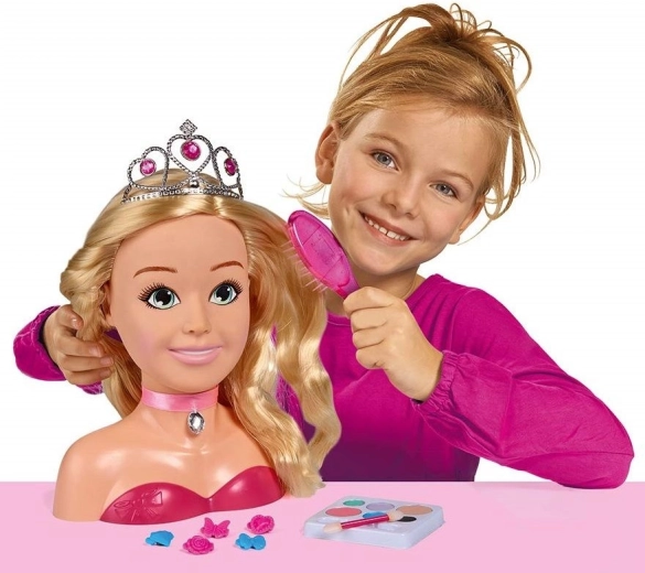 Dette fortryllende stylinghoved med lange blonde hår og lyserødt bånd med sten er ideelt til små frisører og stylister. Takket være sættet af tilbehør – fra den sølvfarvede krone til børste, hårklemmer og elastikker samt en palette med makeup – kan børn nemt skabe eventyrlige frisurer og blid makeup.