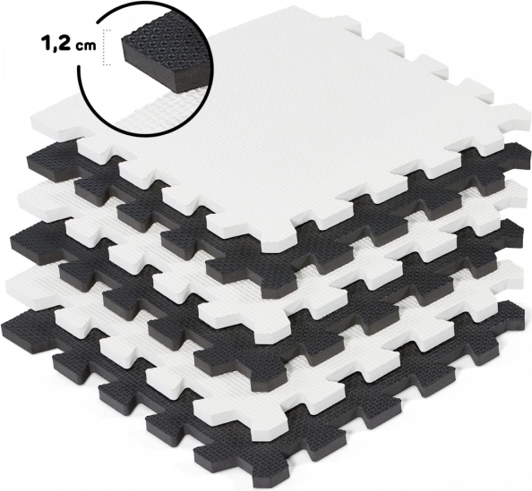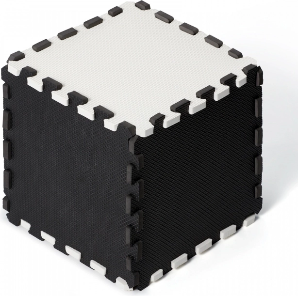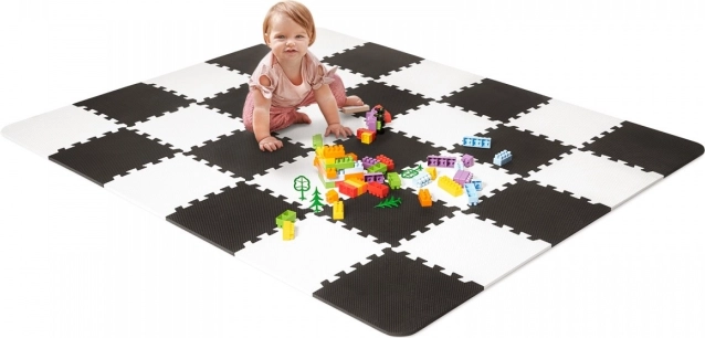 Luno skumpuslespil i tidløs sort-hvid forvandler enhver børnekrog til et behageligt og sikkert sted at lege. Med en tykkelse på 1,2 cm dæmper det stød og støj og isolerer effektivt mod kolde gulve – ideelt til parket, fliser eller linoleum.