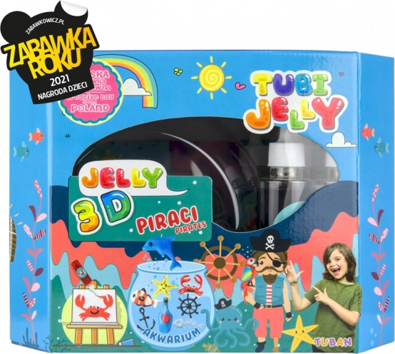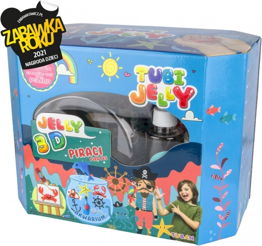 Opdag det kreative sæt Tubi Jelly pirater 3D med et stort akvarium på 3,7 l, så du kan lave farverige 3D geléfigurer med havtema. Sættet indeholder 8 geléfarver inklusive neon og glitter, aktivator, vandkrystaller samt 15 skabeloner + 1 tom til dit eget design. Fantastisk sjov for kreative børn – se den flydende gelé forvandle sig til faste figurer, klar til leg og udstilling.