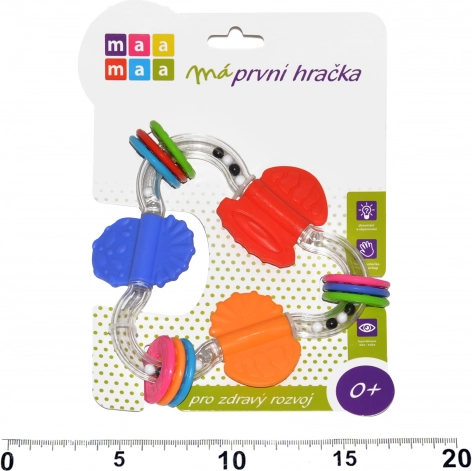 Farverig rangle trekant 14 cm MaaMaa til børn fra fødslen. Nemt greb, beroligende lyd, sikre materialer, testet efter EU- og CZ-standarder.