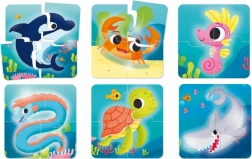 Dette sæt indeholder 6 illustrerede kort med havdyr, hvor hver består af 4 store brikker. Takket være kraftige farver og enkle former orienterer børn sig nemt og forstår hurtigt princippet i at lægge puslespil. Brikkernes størrelse er tilpasset små hænder og støtter hånd–øje-koordinationen.