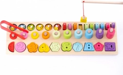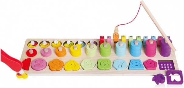 Denne multifunktionelle trælegetøj er ideel til de første skridt ind i verden af tal og former. Børn øver gennem leg farvegenkendelse, tilknytning af tal 1–10, trækning af ringe og at fange brikker med en magnetisk fiskestang. Sættet indeholder også plastikpincetter for øget sværhedsgrad og træning af greb.