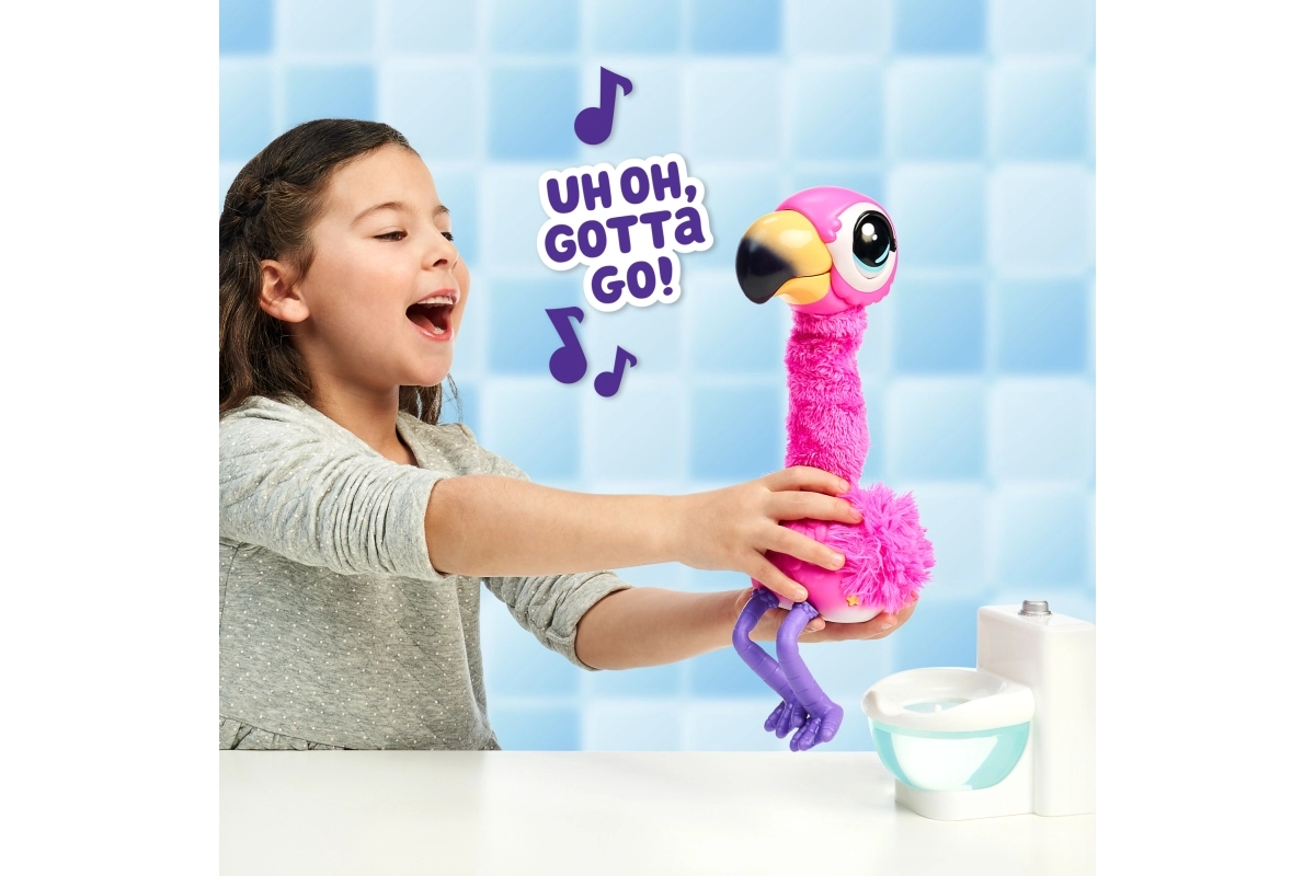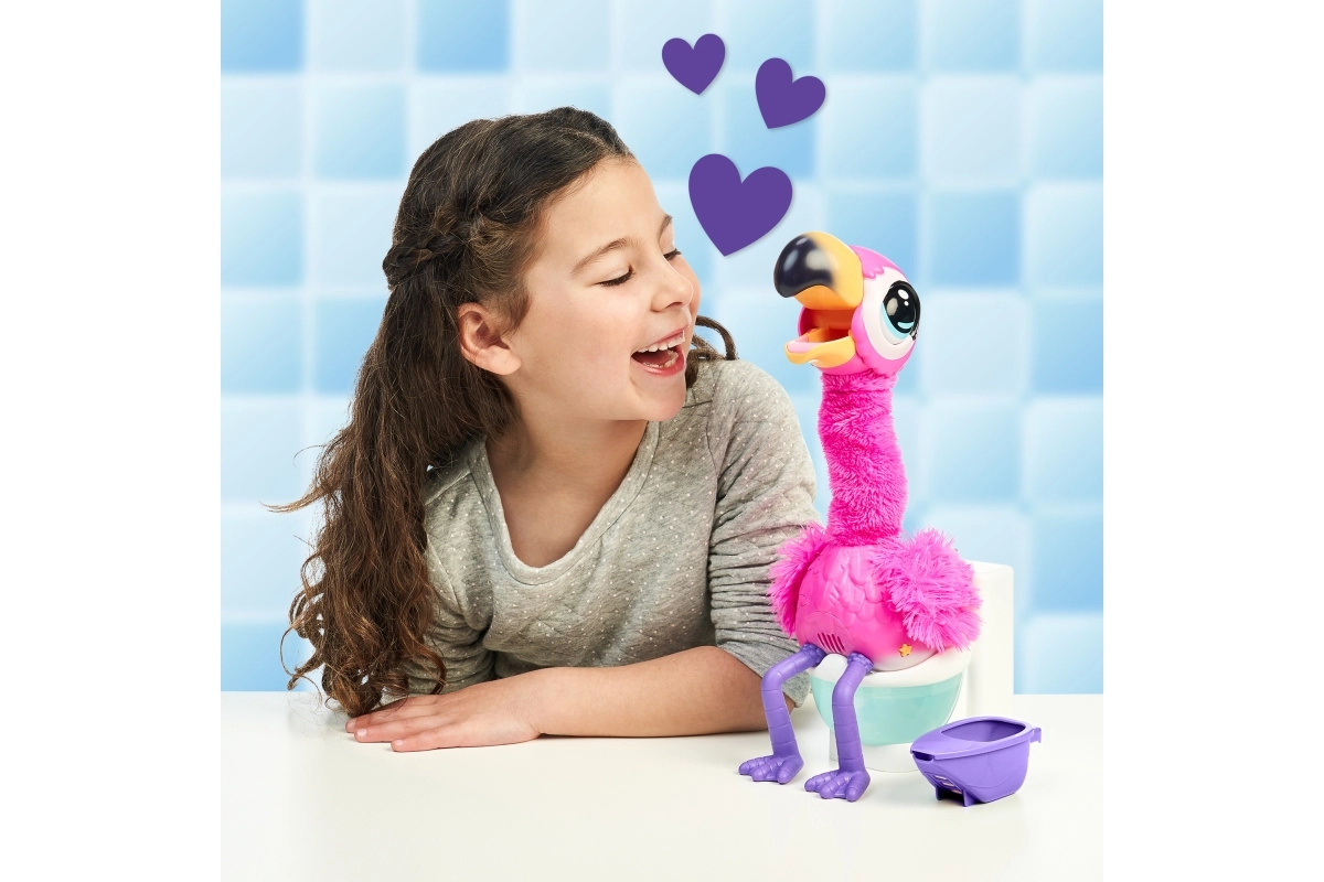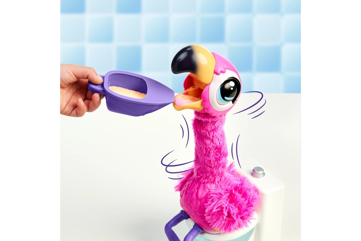 Det sjove interaktive flamingo Little Live Pets vil glæde børn ved at lade sig fodre med særlig Aqua-sand, synger, danser, taler og går på toilettet efter maden. Den annoncerer det med den engelske sætning “Uh, oh, I gotta go”, gentager ejerens ord, og takket være det genanvendelige sand er underholdningen sikret igen og igen.