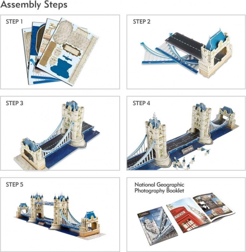 Oplev London gennem opbygningen af et af byens mest berømte symboler – Tower Bridge. 3D-puslespillet fra National Geographic-serien fra CubicFun byder på realistisk udførelse, præcise detaljer og en behagelig byggeoplevelse uden behov for lim. Dele af ca. 3 mm skum med lamineret tryk sikrer både styrke og et smukt udseende på den færdige model.