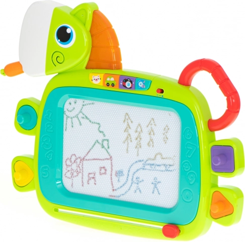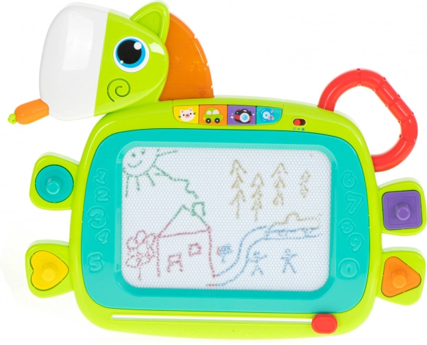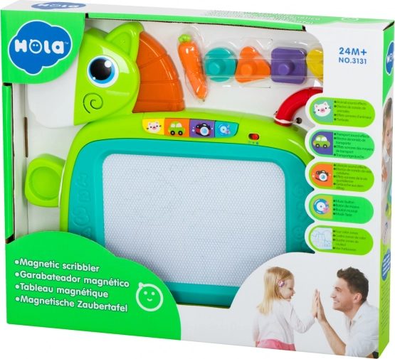 Den magnetiske tavle fra HOLA er et fremragende valg til at udvikle kreativitet og finmotorik. Takket være fire farvezoner bliver billederne skabt i farver, som børn elsker. Med ét træk i skyderen visker du fladen ren, og den er klar til nye idéer. Hesteformen med lysende man og glade lyde motiverer børn til leg.