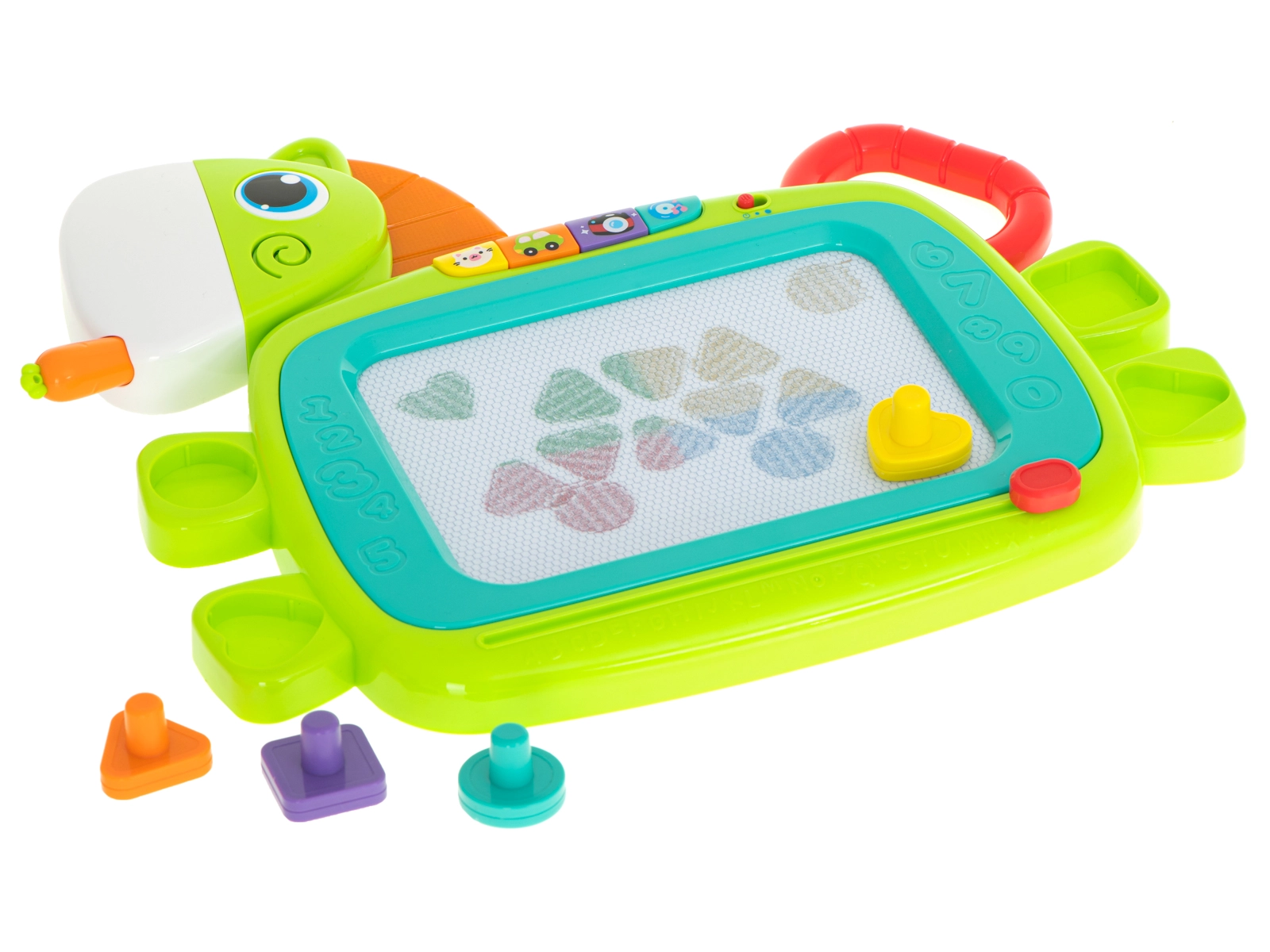 - Farvet magnetisk tegneflade (4 zoner), viskning med skyder, lyseffekter (man), lyde og melodier, 2 lydstyrkeniveauer, mulighed for at slukke lyden