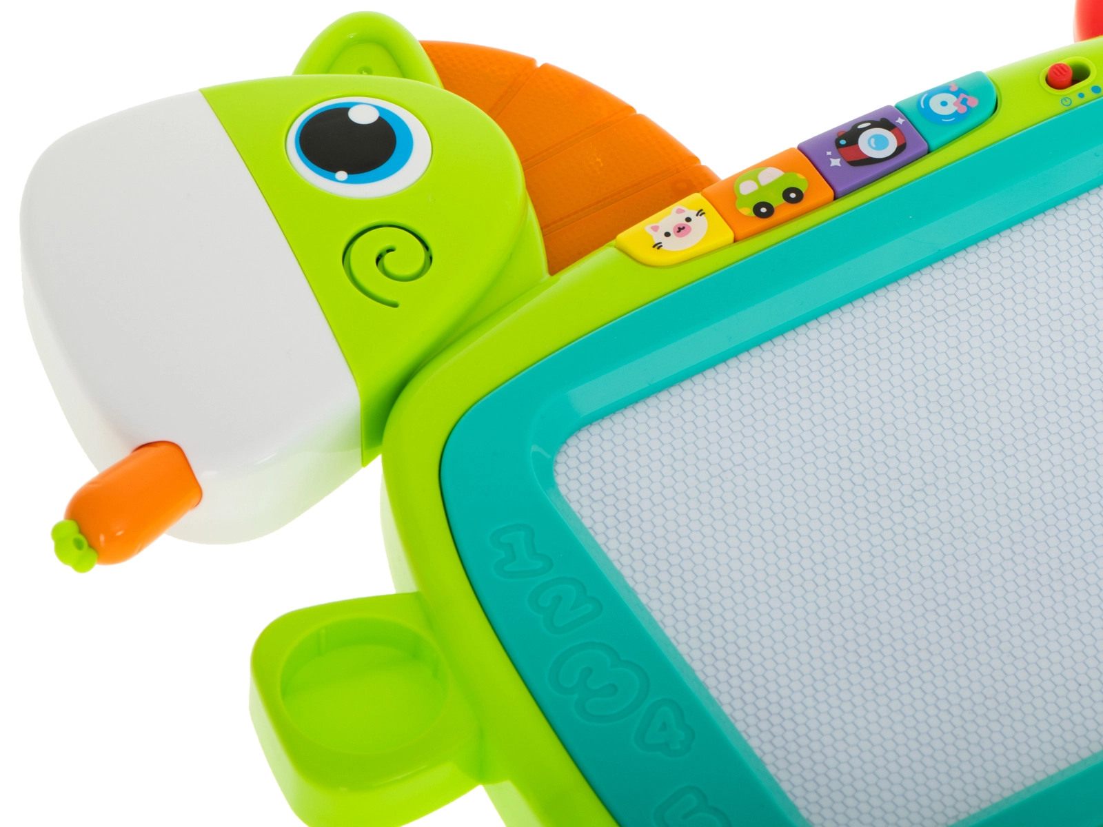 De interaktive elementer byder på dyrelyde, transportlyde, lyde fra hjemmet og glade melodier. Legetøjet har 2 lydstyrkeniveauer og mulighed for helt at slukke lyden. Penen i gulerodsform laver en knaselyd, når den sættes ind i hestens “mund”. Tavlens kanter er dekoreret med opstående bogstaver og tal – ideelt til den første introduktion til former.