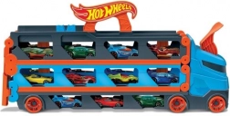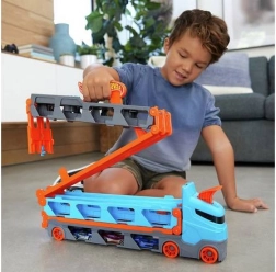 Forvandl lastbilen på ingen tid til en fuld racerbane. Transporteren rummer op til 20 biler bag gennemsigtige vinduer, så du altid har samlingen i sigte. Når du trækker i håndtaget, folder traileren sig ud til en tosporet bane på 1,8 m, mens førerkabinen bliver til en dobbelt affyringsstation for fair starter.