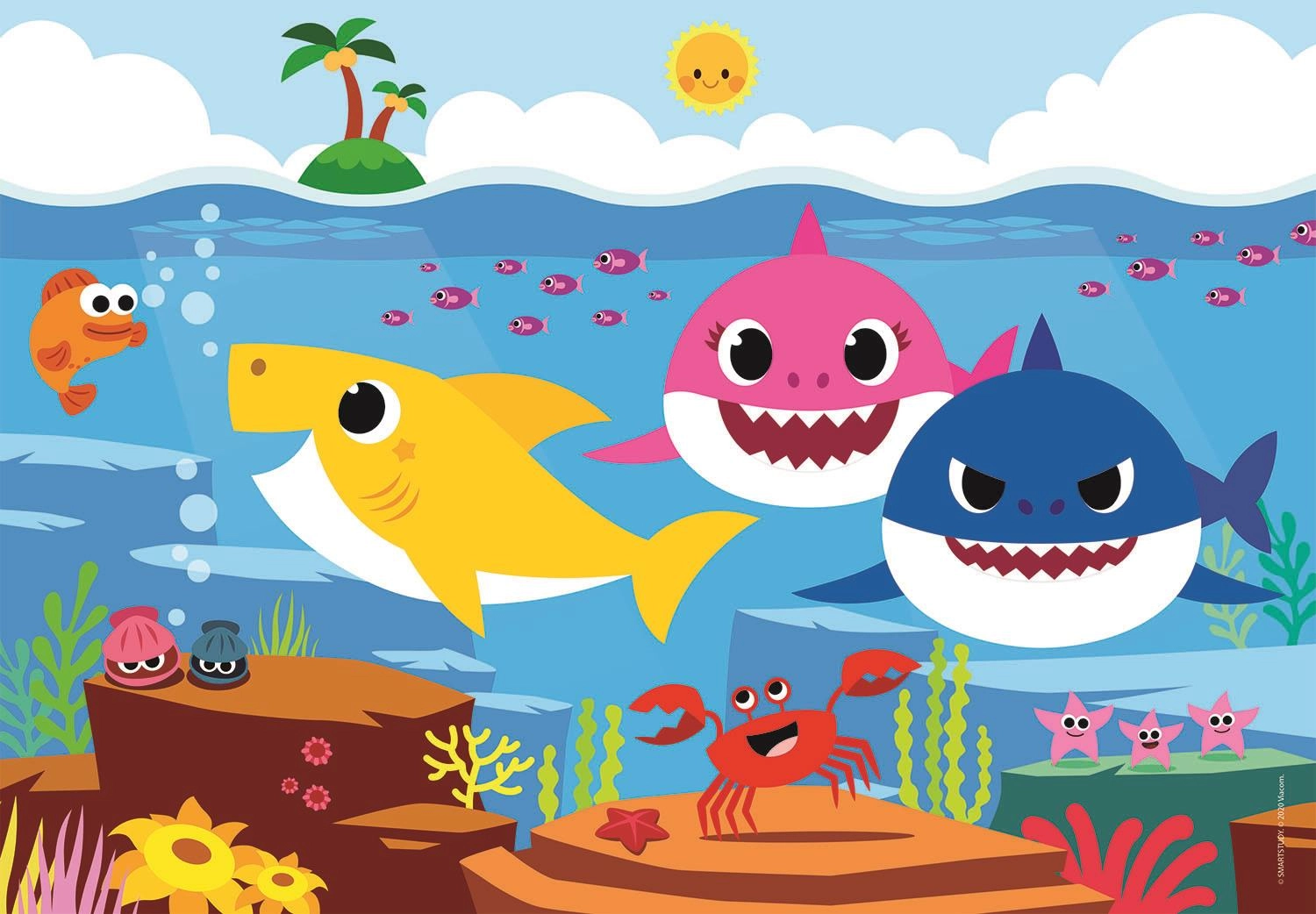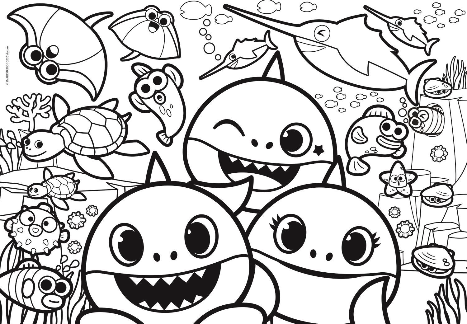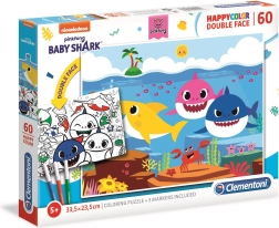 Oplev et kreativt spil, der underholder børn i timevis. Det dobbeltsidede BABY SHARK-puslespil byder på et farverigt motiv med populære havfigurer på den ene side og et sort-hvidt maleark på den anden. Dermed træner børnene ikke kun puslespil, men kan også færdiggøre billedet efter deres egen fantasi.