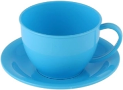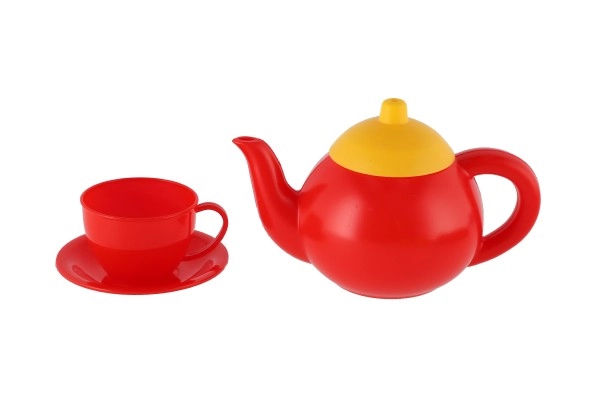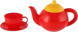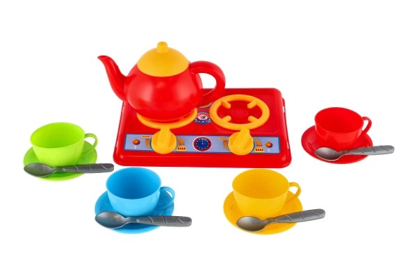 Rød kedel og fire farverige kopper med underkopper gør det muligt at “brygge” og servere te til hele familien eller venner.