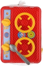 Dette farverige sæt til små kokke indeholder alt, hvad der skal til for sjov madlavning og servering. Den kompakte plastkogeplade med betjeningsknapper suppleres af en rød kedel og fire kopper med underkop og skeer – ideelt til børnenes teselskaber.