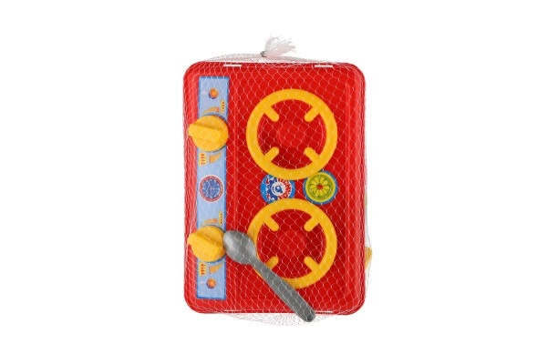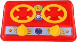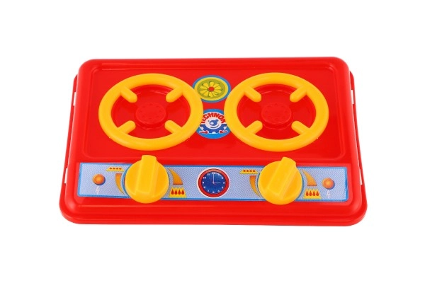 Rød kogeplade med to blus og drejeknapper stimulerer fantasien og lærer børn grundlæggende madlavning gennem sikker leg.