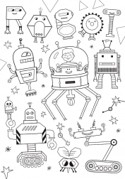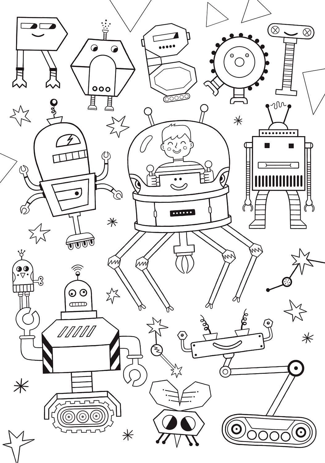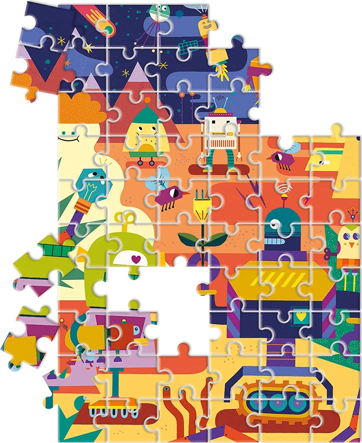 Den ene side er et klassisk puslespil med robotter, den anden er klar til at blive farvelagt – den perfekte kombination til kreativ leg.