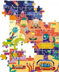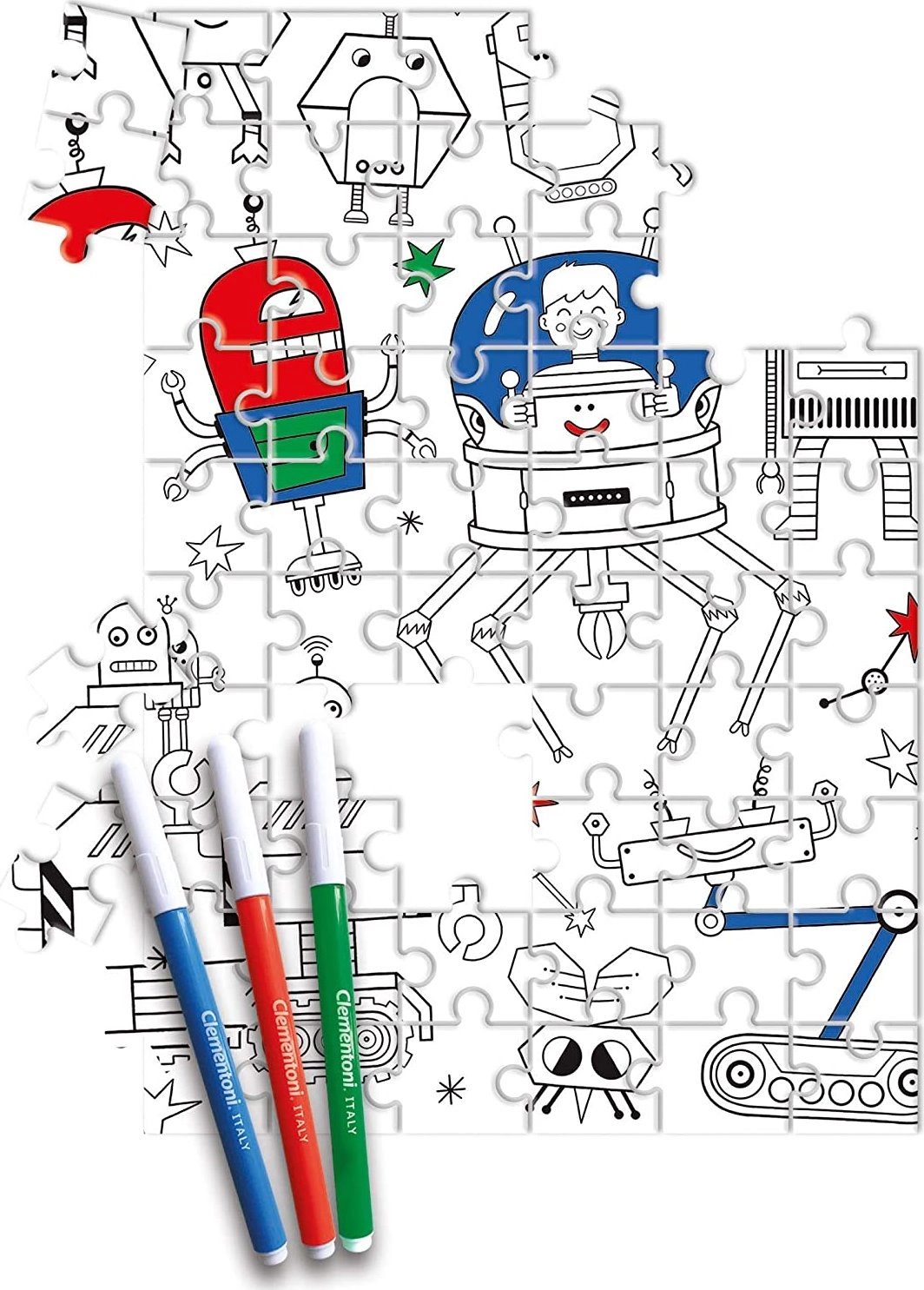 Det dobbeltsidede puslespil CLEMENTONI Robotter giver børn dobbelt så meget sjov: først samler de et motiv fyldt med glade robotter, og derefter kan de farvelægge den anden side selv. Kvalitetsmaterialer og eksklusivt tryk garanterer langtidsholdbare, levende farver og høj slidstyrke – selv ved hyppig brug.
